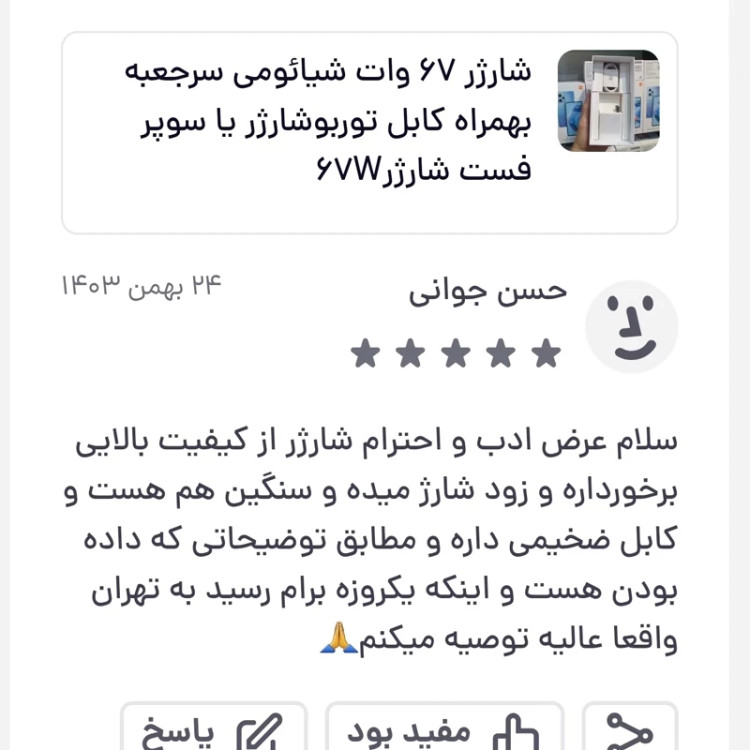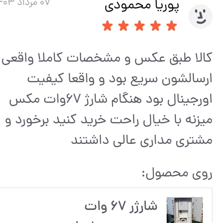 ✅️مشتریان محترم استحضار داشته باشند شارژر های پک دار سرجعبه و اصلی نیستن چرا که در جعبه اصلی گوشی بدون پک هستند ✋️سرجعبه : یعنی از درون جعبه اصلی گوشی خارج شده🤚 همیشه حق با مشتری است 🙏 در باره محصول : 👍کلگی 67وات و کابل 6 آمپر شیائومی از داخل جعبه اصلی برداشته شده است 👍قابلیت شارژر فوق سریع TORBO CHRGE 👍نمایش 67 وات مکس 👍طول کابل 1متر 👍کلگی شارژر پین US یا تیغه ای است 👍کیفیت محصول 100 درصد اصلی است 👍با اطمینان و با تضمین فروشگاه خرید بفرمایید در صورت مغایرت با توضیحات و اصالت کالا وجه شما عودت میشود 🙏 با خیال راحت و اطمینان خرید کنید و بشرط اصلی بودن ببرید مشتریان گرامی استحضار داشته باشند شارژر ها اصلی 67 و 120 وات حتمن هنگام شارژر باید علامت MAX را روی گوشی نمایش بدهند با کابل اصلی 6 آمپر پورت نارنجی با قابلیت توربوشارژر روی همه مدل های شیائومی با خیال راحت خرید کنید شما باید از اداپتور سازگار با دستگاه خود استفاده کنید. خرید شارژر 67 وات شیائومی اورجینال نکتهای اساسی برای حفظ سلامت گوشی شیائومی شماست و توصیه میشود برای جلوگیری از هرگونه آسیب به گوشی خود از لوازم جانبی اصلی و اورجینال استفاده کنید.شارژر 67 وات شیائومی از UL95-V0 مواد ضد حریق و مقاوم در برابر درجه حرارت بالا، قابل اعتماد و ایمن و ولتاژ ورودی به شارژر شیائومی برابر با 100-240V است و نکته جالب شارژر این است که به صورت خودکار ولتاژ گوشی شما را اندازه می گیرد و بر اساس آن گوشی شما را با نهایت سرعت شارژ می شود