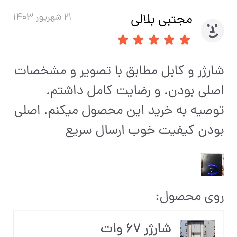 ✅️مشتریان محترم استحضار داشته باشند شارژر های پک دار سرجعبه و اصلی نیستن چرا که در جعبه اصلی گوشی بدون پک هستند ✋️سرجعبه : یعنی از درون جعبه اصلی گوشی خارج شده🤚 همیشه حق با مشتری است 🙏 در باره محصول : 👍کلگی 67وات و کابل 6 آمپر شیائومی از داخل جعبه اصلی برداشته شده است 👍قابلیت شارژر فوق سریع TORBO CHRGE 👍نمایش 67 وات مکس 👍طول کابل 1متر 👍کلگی شارژر پین US یا تیغه ای است 👍کیفیت محصول 100 درصد اصلی است 👍با اطمینان و با تضمین فروشگاه خرید بفرمایید در صورت مغایرت با توضیحات و اصالت کالا وجه شما عودت میشود 🙏 با خیال راحت و اطمینان خرید کنید و بشرط اصلی بودن ببرید مشتریان گرامی استحضار داشته باشند شارژر ها اصلی 67 و 120 وات حتمن هنگام شارژر باید علامت MAX را روی گوشی نمایش بدهند با کابل اصلی 6 آمپر پورت نارنجی با قابلیت توربوشارژر روی همه مدل های شیائومی با خیال راحت خرید کنید شما باید از اداپتور سازگار با دستگاه خود استفاده کنید. خرید شارژر 67 وات شیائومی اورجینال نکتهای اساسی برای حفظ سلامت گوشی شیائومی شماست و توصیه میشود برای جلوگیری از هرگونه آسیب به گوشی خود از لوازم جانبی اصلی و اورجینال استفاده کنید.شارژر 67 وات شیائومی از UL95-V0 مواد ضد حریق و مقاوم در برابر درجه حرارت بالا، قابل اعتماد و ایمن و ولتاژ ورودی به شارژر شیائومی برابر با 100-240V است و نکته جالب شارژر این است که به صورت خودکار ولتاژ گوشی شما را اندازه می گیرد و بر اساس آن گوشی شما را با نهایت سرعت شارژ می شود