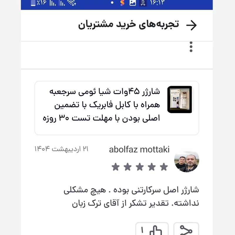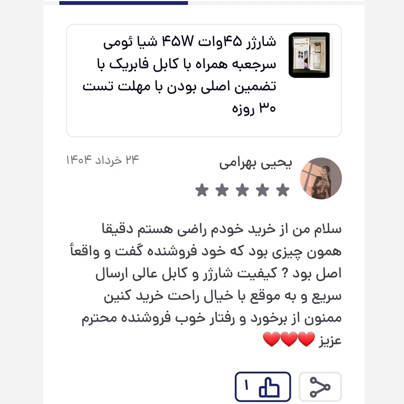 در باره محصول : 👍کلگی 45وات و کابل 3 آمپر پورت نارنجی توربوشارژر شیائومی از داخل جعبه اصلی برداشته شده است 👍قابلیت شارژر فوق سریع TORBO CHRGE 👍طول کابل 1متر 👍کلگی شارژر دو پین است 👍کیفیت محصول 100 درصد اصلی است 👍با اطمینان و با تضمین فروشگاه خرید بفرمایید در صورت عدم مغایرت با توضیحات و اصالت کالا وجه شما عودت میشود 🙏 با خیال راحت و بشرط اصلی بودن و اطمینان خرید کنید در صورت درخواست ارسال با جعبه اصلی لطفا قبل از ثبت سفارش با غرفه دار هماهنگ فرمایید هزینه جعبه خالی 150 هزار تومن میباشد