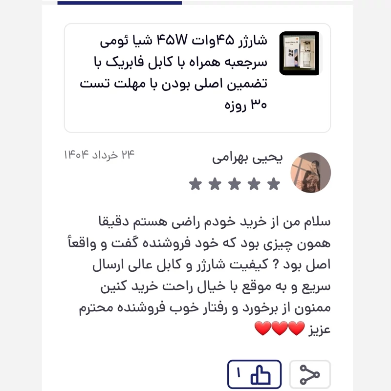 شارژر 45وات داخل جعبه 45Wشیائومی سرجعبه همراه با کابل فابریک 4A با تضمین اصلی بودن با مهلت تست 30 روزه